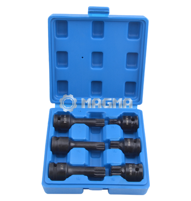 1/2" Drive Spline Impact Socket Set (MG50385)Applications include M14 for VW LT/Transporter, M18 for Volkswagen Golf, M16 for Volkswagen Sharan.Made of Cr-Mo. 1/2" Drive, M14, M16, M18.Length: 43mm & 78mm.Packaged in blow mold case