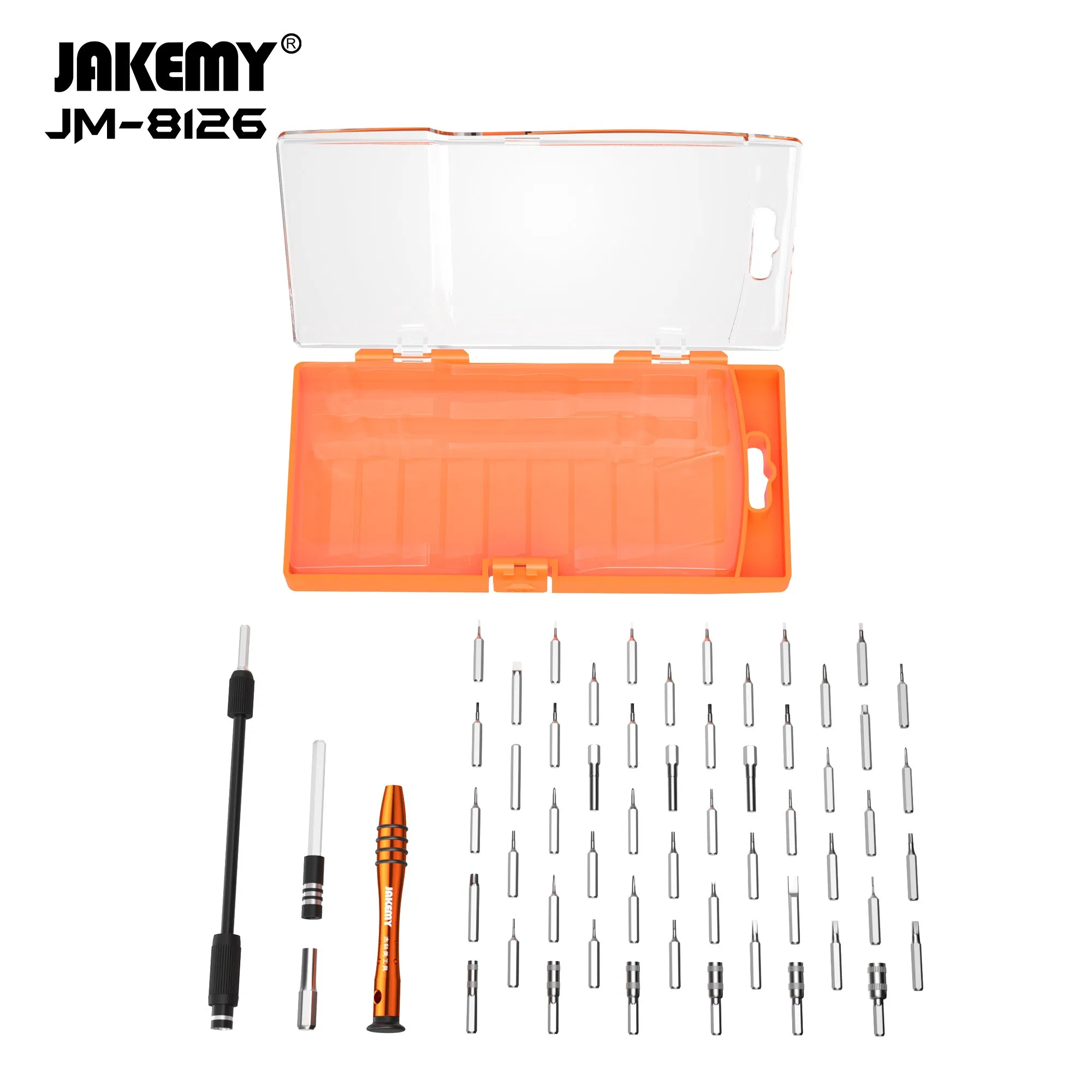 JAKEMY JM-8126 Portable DIY Repair Tool with Mini Screwdriver Suction Cup Crowbar Tweezers Stainless Driver Bits for Cell Phone Laptop Eyeglass.Features:Tool box - Made from ABS material. The transparent reinforce cover makes it clearer and firm. New press-button switch makes it stable and fashionab......