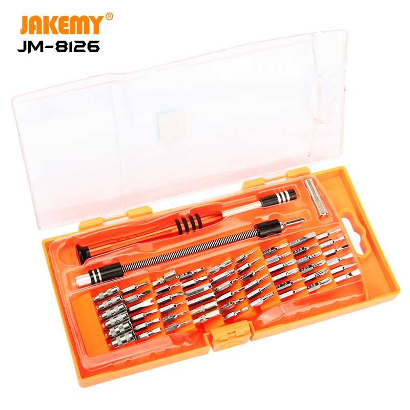 JAKEMY JM-8126 Portable DIY Repair Tool with Mini Screwdriver Suction Cup Crowbar Tweezers Stainless Driver Bits for Cell Phone Laptop Eyeglass.Features:Tool box - Made from ABS material. The transparent reinforce cover makes it clearer and firm. New press-button switch makes it stable and fashionab......